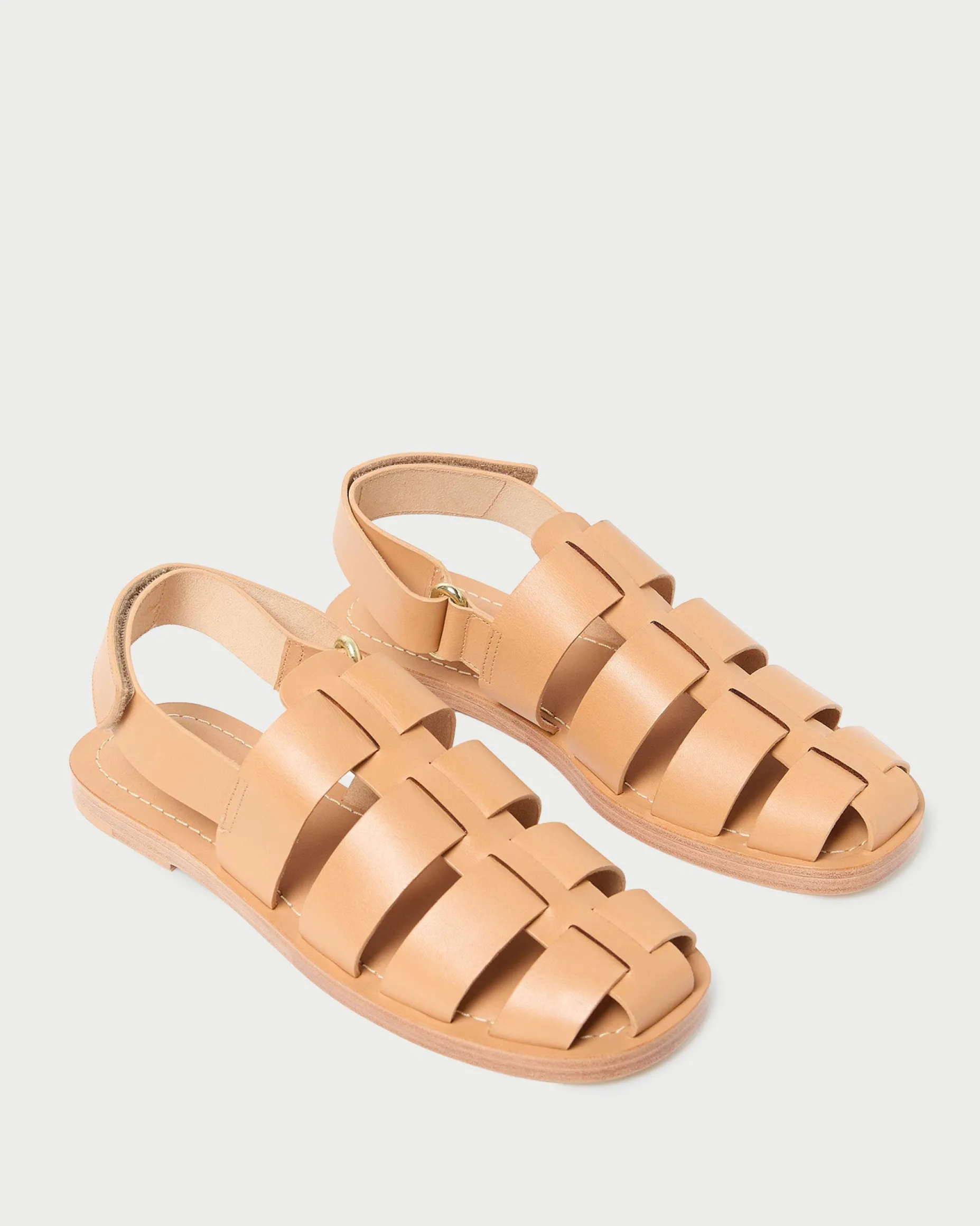 Welcome to Loeffler Randall. Discover our collection of beautiful, handcrafted styles from shoes to RTW to accessories. |Flat caged sandal in honey Italian vachetta leather. Features a padded leather footbed, a buckle detail, and a velcro closure. |Refurbish seasonally or as needed by a professional. For best results, avoid consistent exposure to water.|||||Flat sandal in honey Italian vachetta leather. Features a padded leather footbed, a buckle detail, and a velcro closure.
