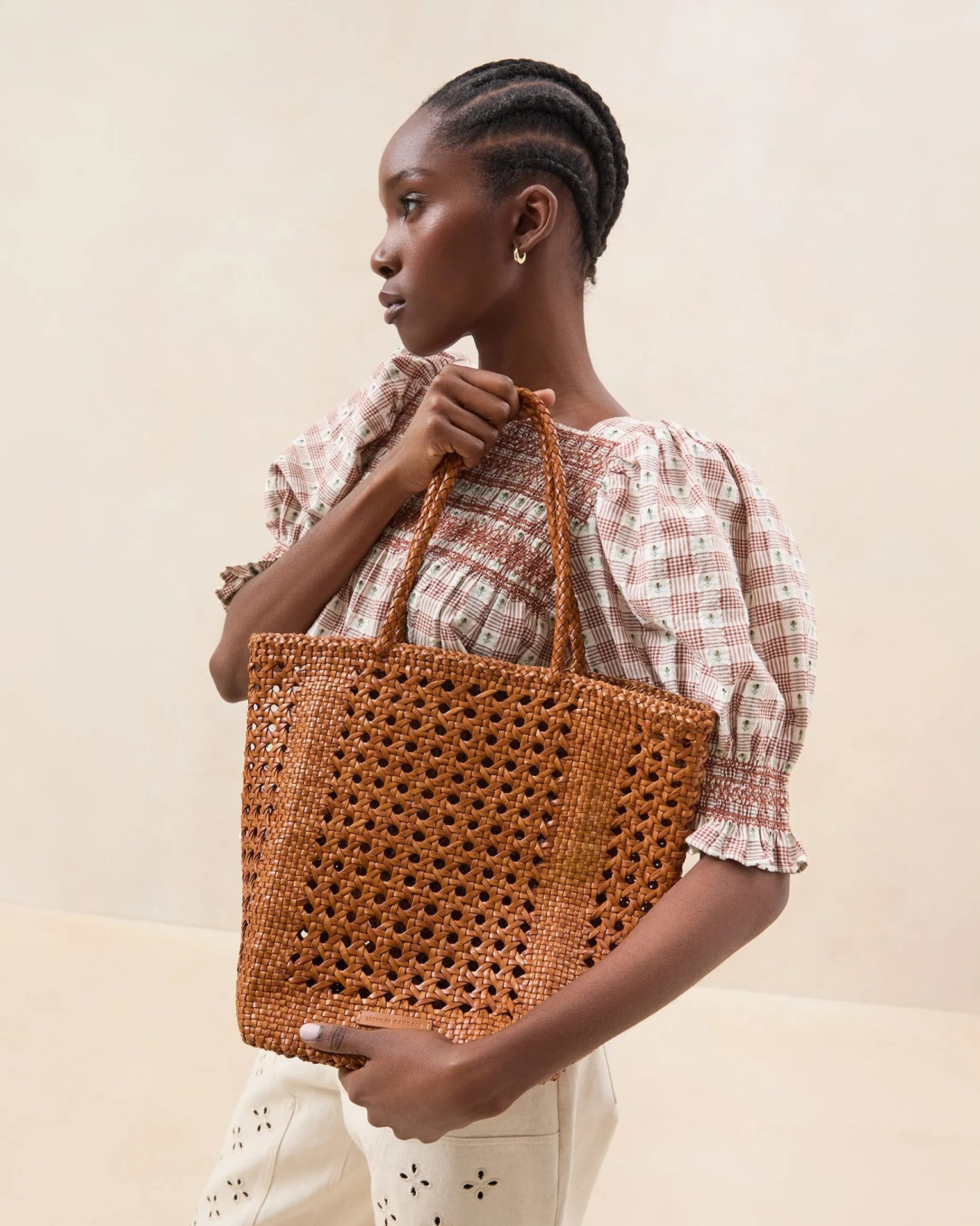 Welcome to Loeffler Randall. Discover our collection of beautiful, handcrafted styles from shoes to RTW to accessories. |Open-weave carry-all tote in timber brown woven leather. Features a blind embossed logo leather patch. |Buffalo leather develops a beautiful patina by deepening in color over time. It is vulnerable to water stains and tonal changes from the sun. It is recommended to avoid contact with lighter fabrics, as vegetable dyes have the potential to transfer.|Open-weave carry-all tote in timber brown woven leather. Features a blind embossed logo leather patch.