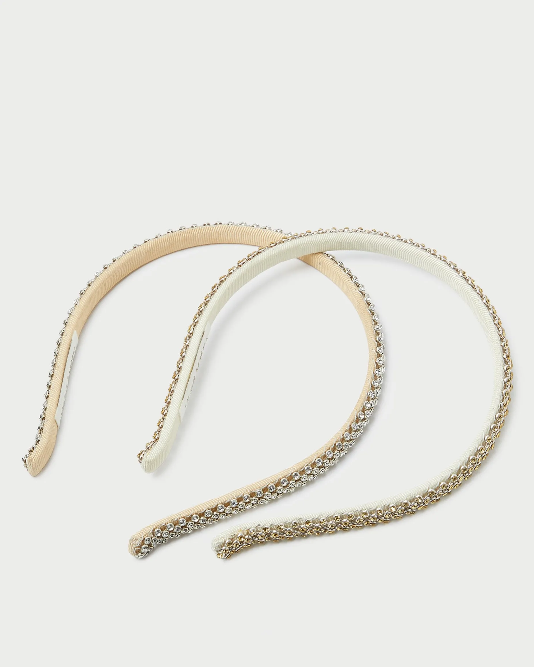 Welcome to Loeffler Randall. Discover our collection of beautiful, handcrafted styles from shoes to RTW to accessories. |Set of two thin headbands in gold and hay cotton fabric topped with gold diamanté.|It is recommended to avoid contact with abrasive materials and rough surfaces. Store in a dust bag out of direct sunlight when not in use.|Set of two thin headbands in gold and hay cotton fabric topped with gold diamanté.