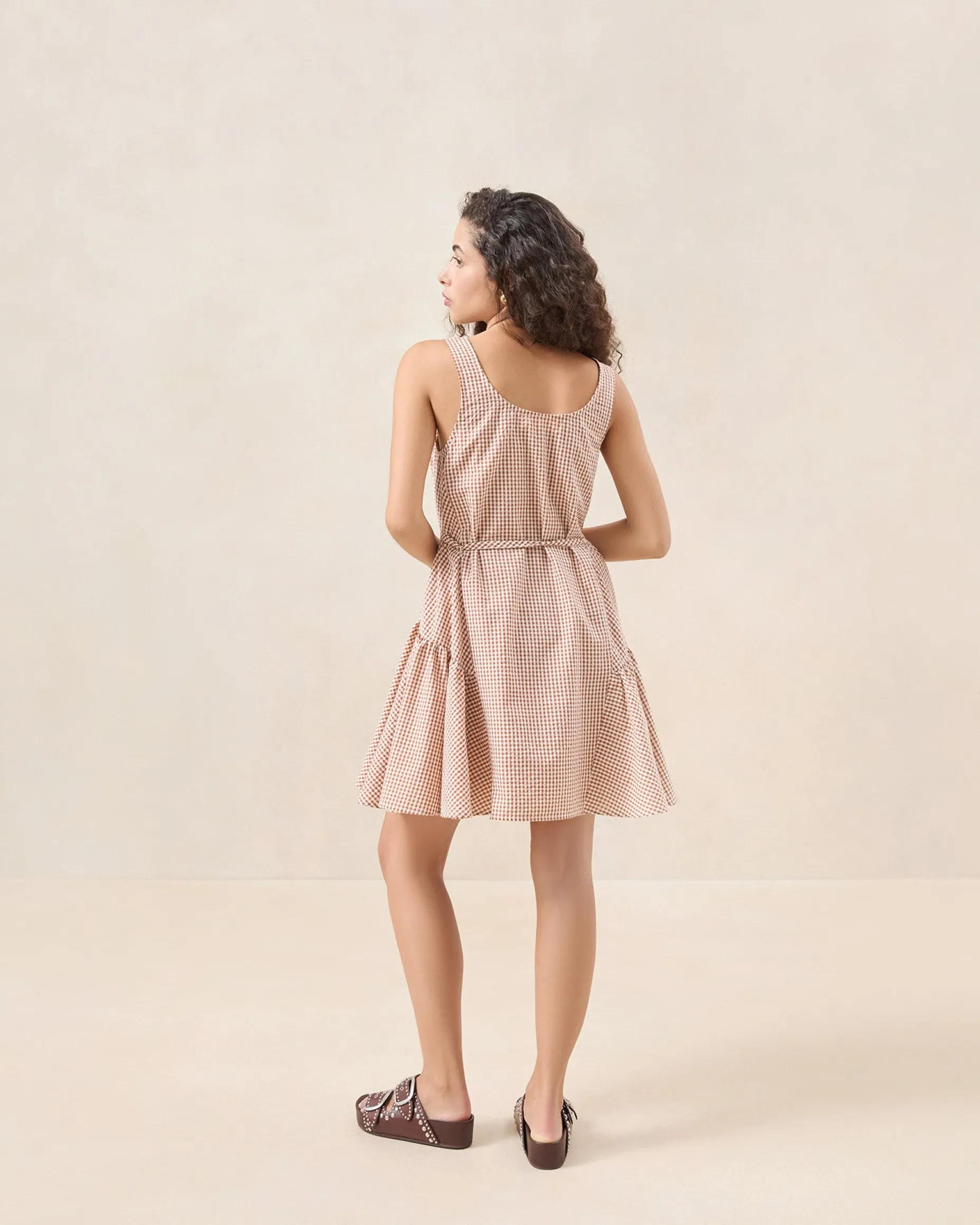 Welcome to Loeffler Randall. Discover our collection of beautiful, handcrafted styles from shoes to RTW to accessories. |Sleeveless dress in brown gingham. Avi features flounces along the sides for extra volume, a removable fabric belt, and a seersucker texture. Hits a few inches above the knee.|Dry clean only.|Sleeveless dress in brown gingham. Avi features flounces along the sides for extra volume, a removable fabric belt, and a seersucker texture. Hits a few inches above the knee.SizeXSSMLXLShoulder11"11.5"12"12.5"13"Bust35.5"37.5"39.5"41.5"43.5"Waist45.5"47.5"49.5"51.5"53.5"Hip57"59"61"63"65"Length34.5"35"35.5"36"36.5"