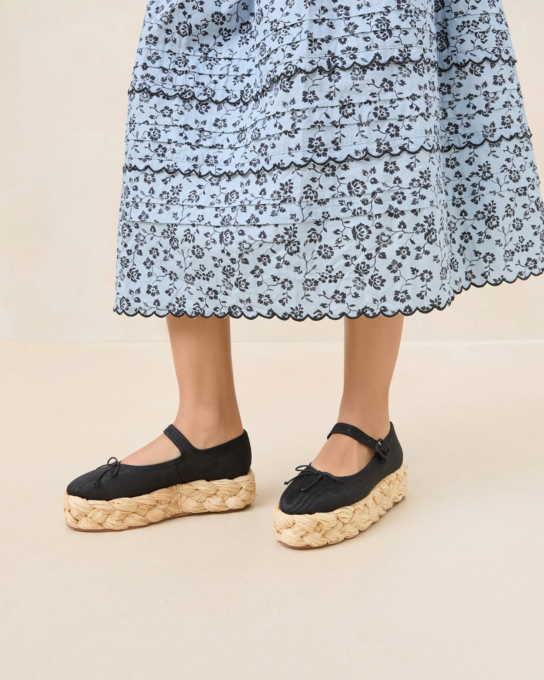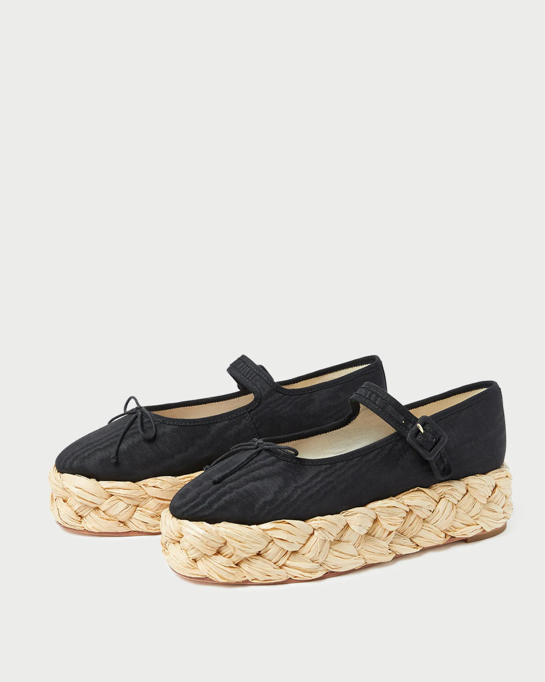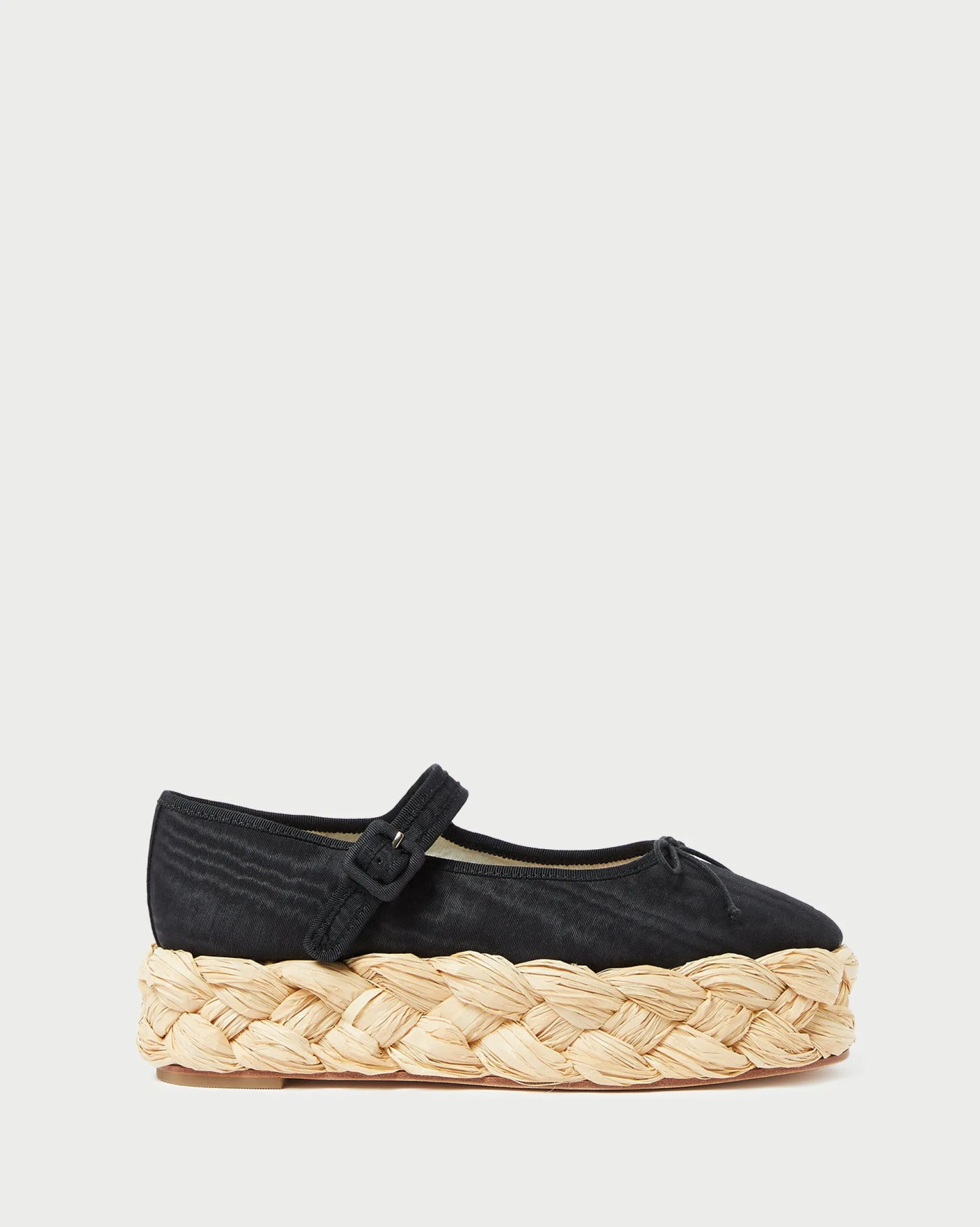Welcome to Loeffler Randall. Discover our collection of beautiful, handcrafted styles from shoes to RTW to accessories. |Mary Jane flatform in black moiré with an adjustable bridge strap and bow detail. Features a padded leather footbed with gold stamped logo, an almond toe, and a buckle closure. 1.5-inch platform.|Moiré fabric is delicate. Avoid contact with abrasive materials.|Mary Jane flatform in natural straw with an adjustable bridge strap and bow detail. Features a padded leather footbed with gold stamped logo, an almond toe, and a buckle closure. 1.5-inch platform.|We selected this material for its exceptional quality and appearance. As with most natural materials, variations in thickness and color are to be expected. Due to the delicate nature of the fiber, normal wear may occur over time. It is recommended that raffia not be exposed to water in order to maintain its appearance.|Mary Jane flatform in black moiré with an adjustable bridge strap and bow detail. Features a padded leather footbed with gold stamped logo, an almond toe, and a buckle closure. 1.5-inch platform.