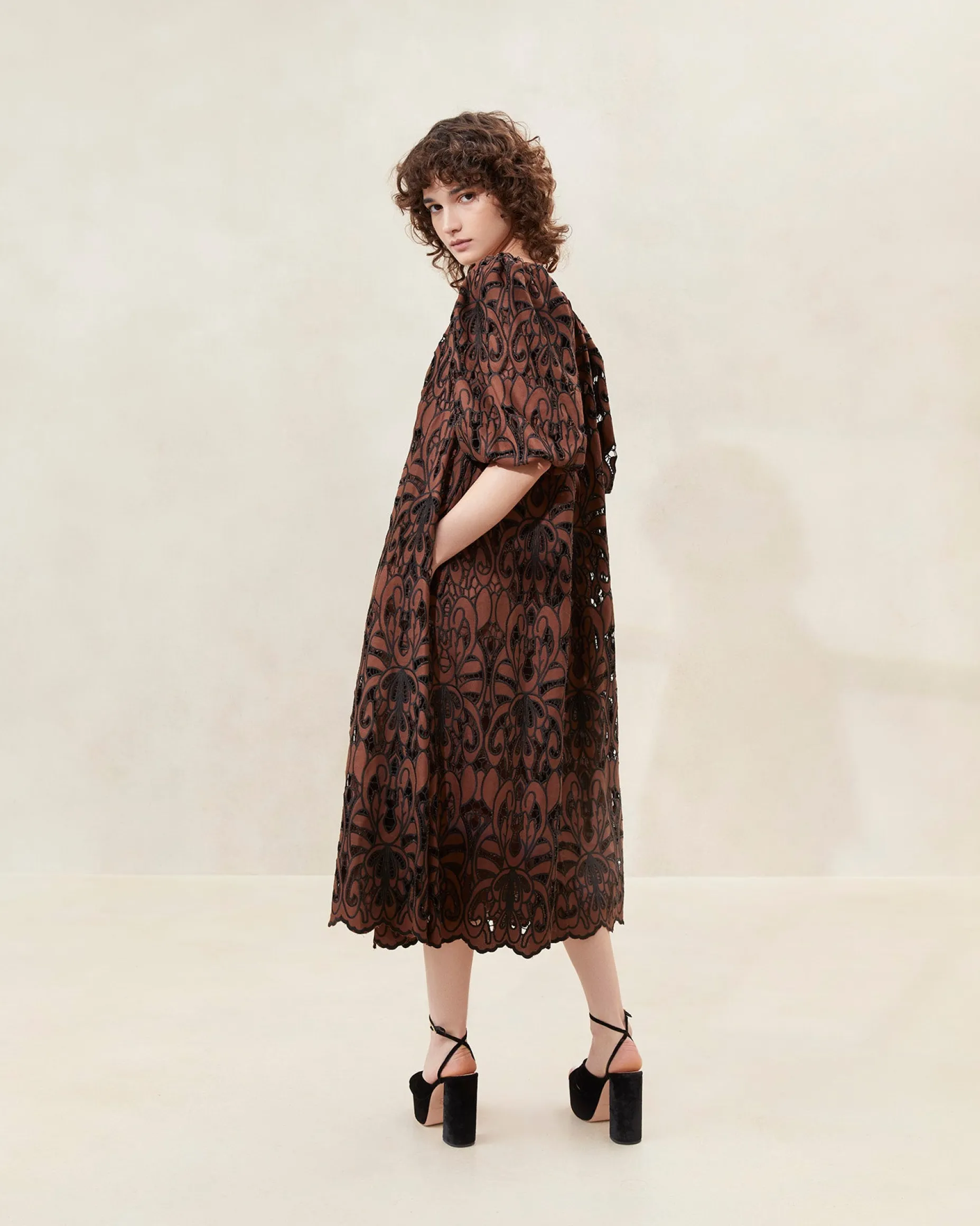 Welcome to Loeffler Randall. Discover our collection of beautiful, handcrafted styles from shoes to RTW to accessories. |Midi-length dress in blue and cream striped yarn-dyed cotton. Features a rounded neckline with self-tie closure and puff sleeves. Unlined.|Hand wash cold, line dry.|Oversized flowy dress in black and dark brown linen lace. Features puff sleeves, pockets, and light gathering at the rounded neckline. Closes with a tie detail at the back neck.|Hand wash warm. Do not bleach. Do not dry clean.u0026nbsp;|Oversized flowy dress in green and cream-colored linen lace. Features puff sleeves, pockets, and light gathering at the rounded neckline. Closes with a tie detail at the back neck.|Hand wash warm. Do not bleach. Do not dry clean.u0026nbsp;|Midi-length dress in blue and cream striped yarn-dyed cotton. Features a rounded neckline with self-tie closure and puff sleeves. Unlined.SizeXSSMLXLBust37.5"39"40.5"42"43.5"Waist43.5"45"46.5"48"49.5"Hip51.5"53"54.5"56"57.5"Length48.5"49.5"50.5"51.5"52.5"